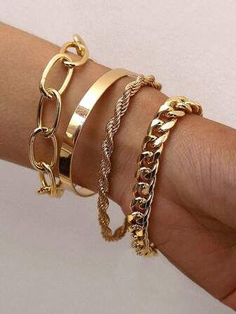 Elevate your everyday look with this 4-piece ladies' gold bracelet set crafted from durable stainless steel. Designed for daily wear, each bracelet combines stylish elegance with lasting strength, making them perfect for casual or professional settings. Their versatile design allows effortless pairing with various outfits, ensuring you always have a polished accessory at hand.